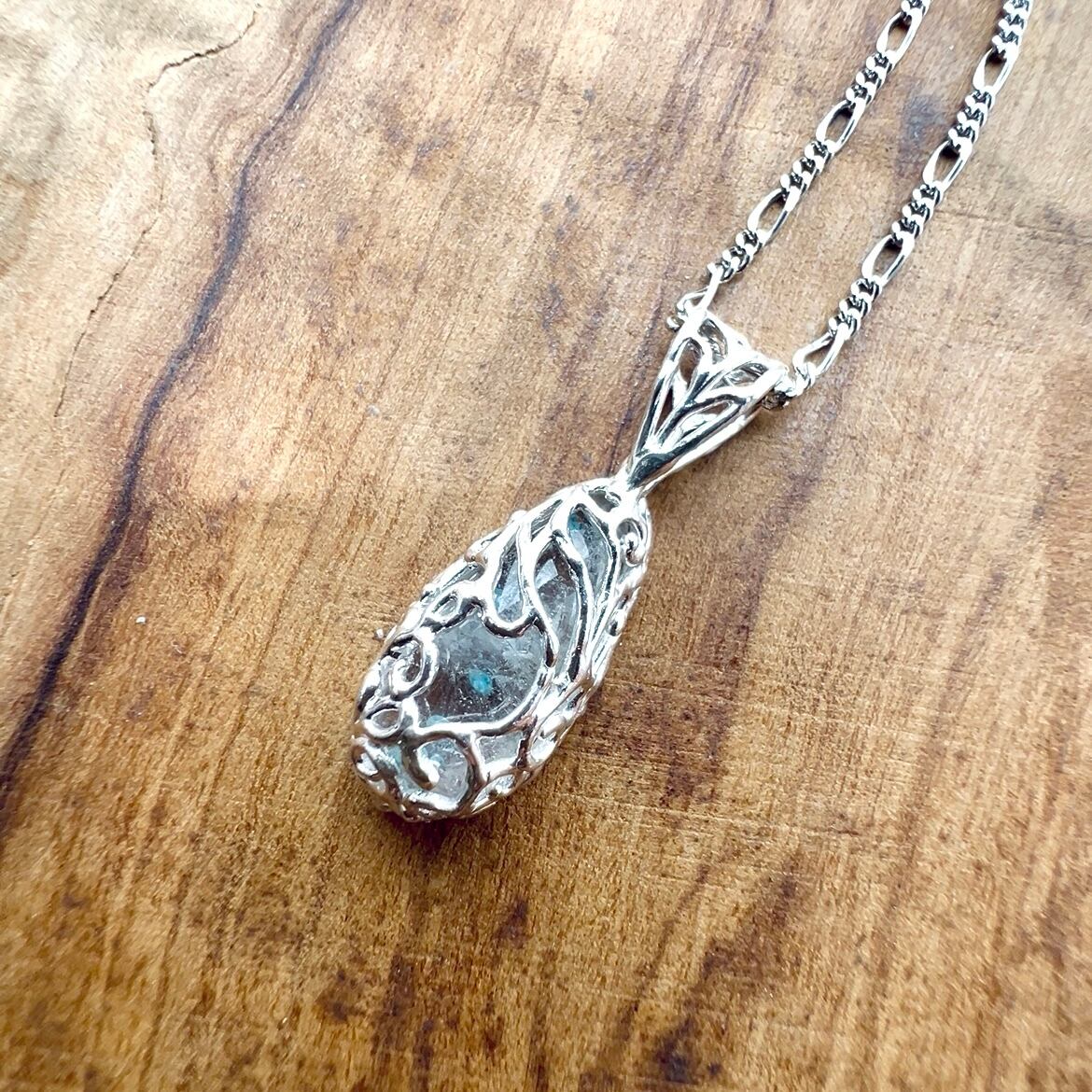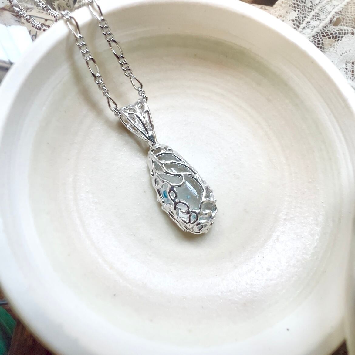 繊細な銀線透かしの石枠は打ち寄せる波のようなイメージで。