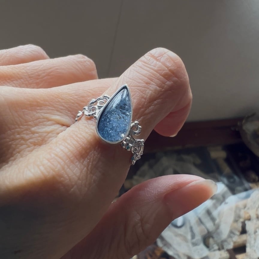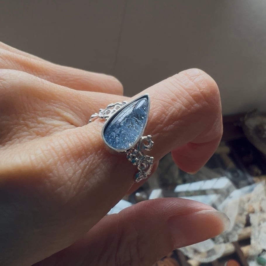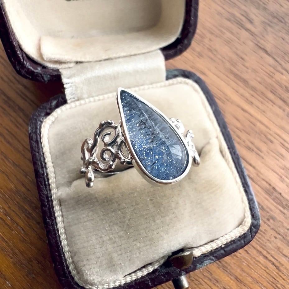 青い針状の結晶が美しいデュモルチェライトインクォーツのリングです。