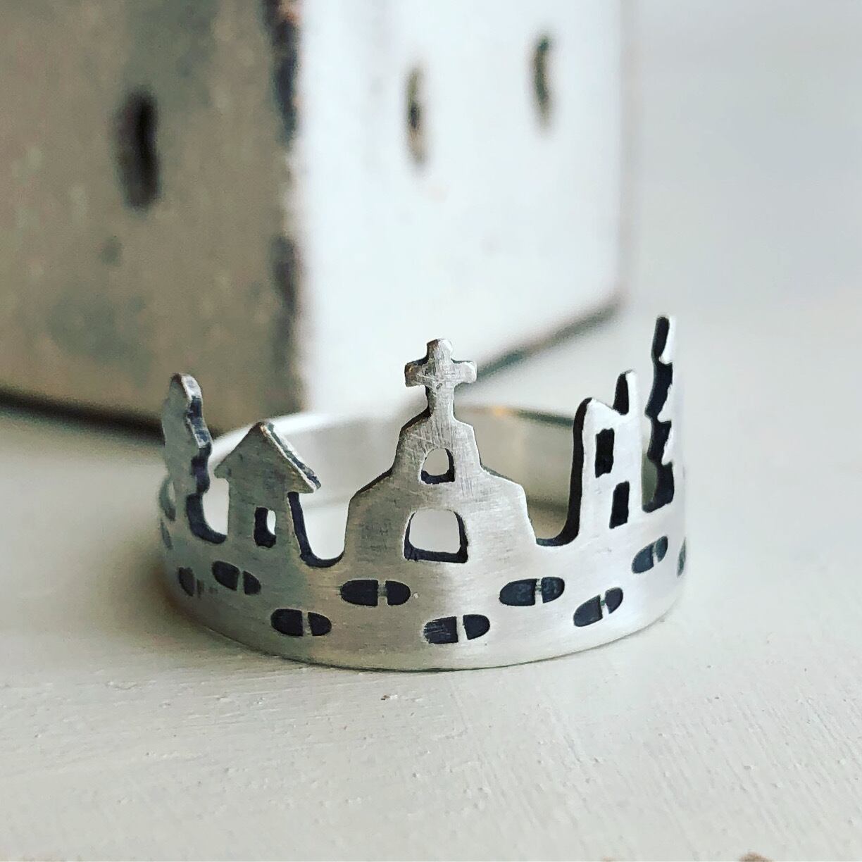 一枚の金属板から街並みを切り抜き、足跡刻印を打ちました。