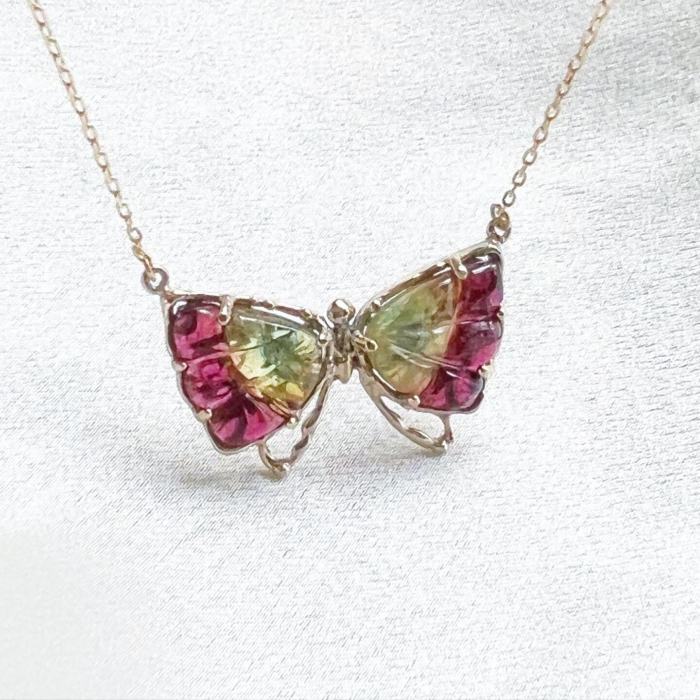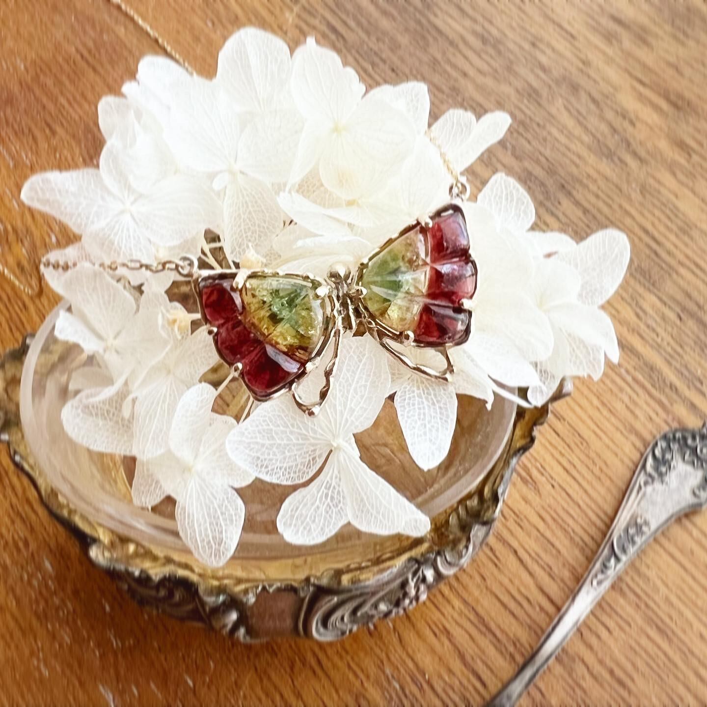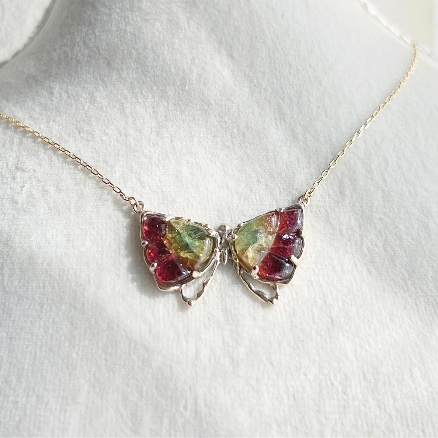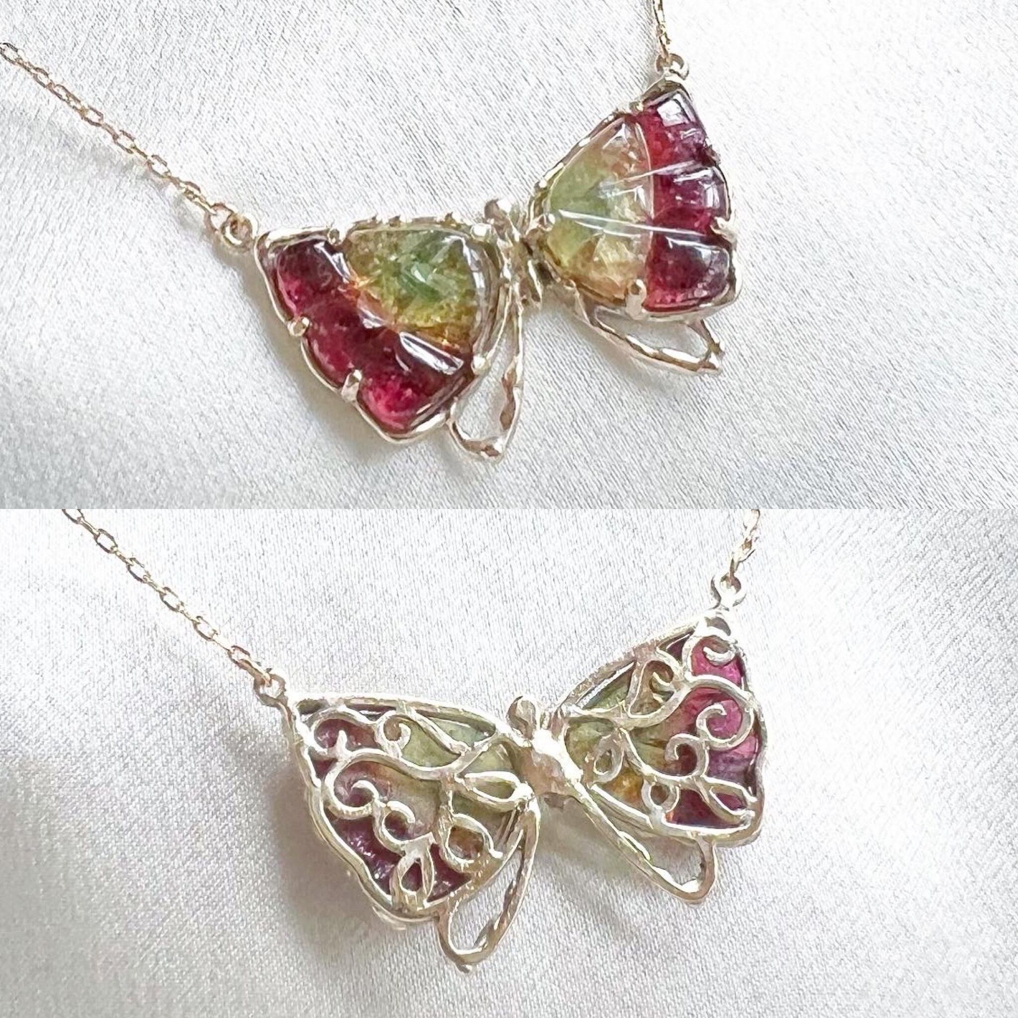 裏面に透かしの装飾を施し、春の妖精を思わせるような可愛い蝶々のネックレスに仕立てました。