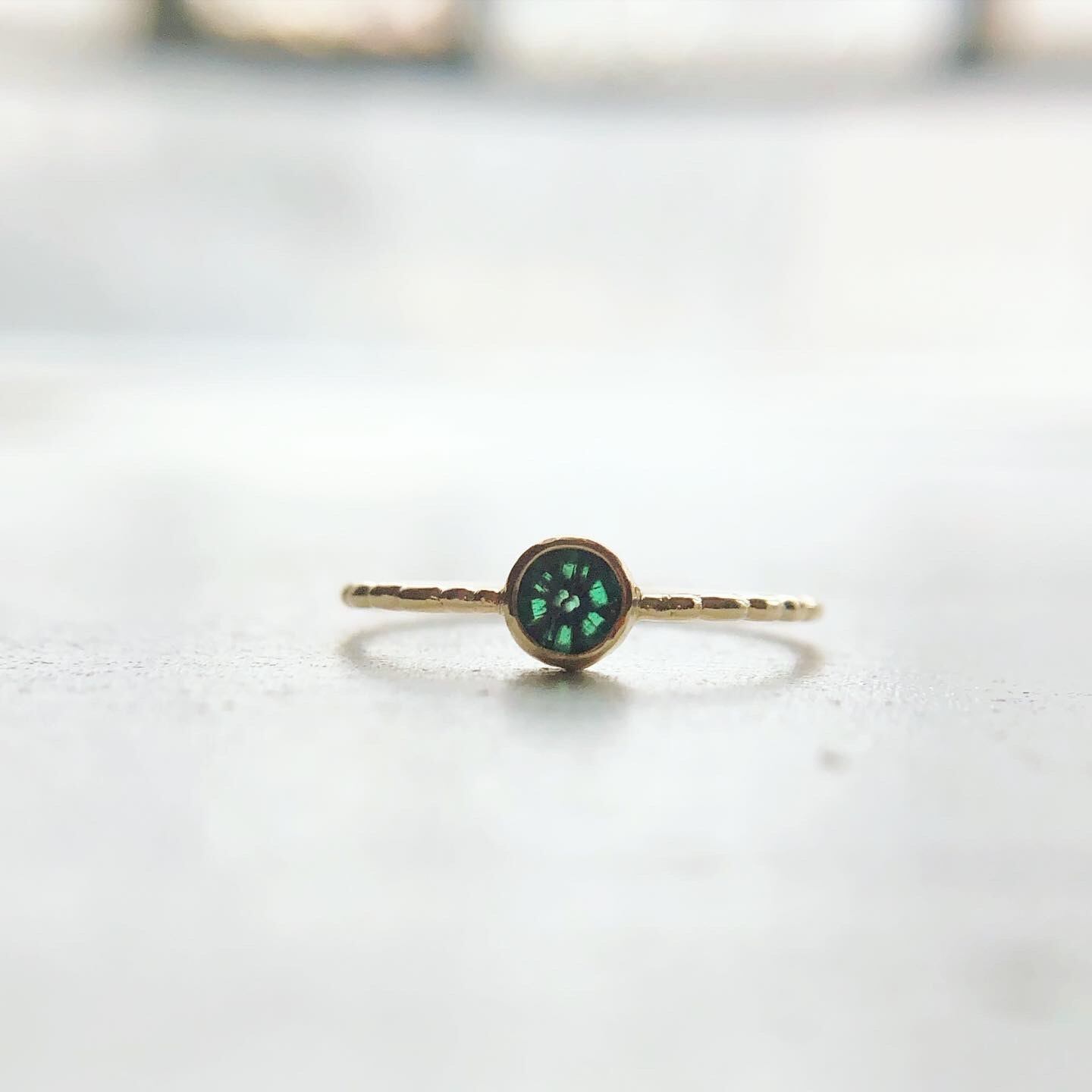 グリーンが映えるゴールド、18金でシンプルな覆輪留めのリングに仕立てました。