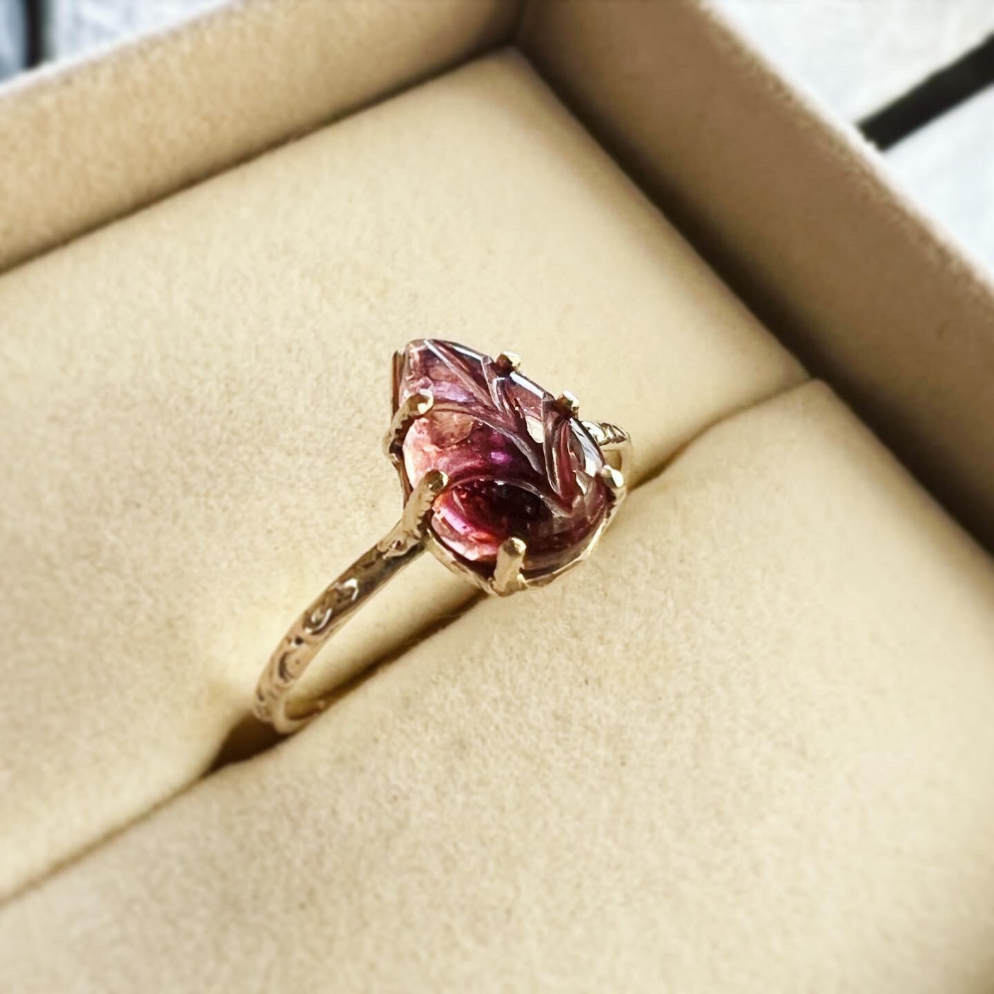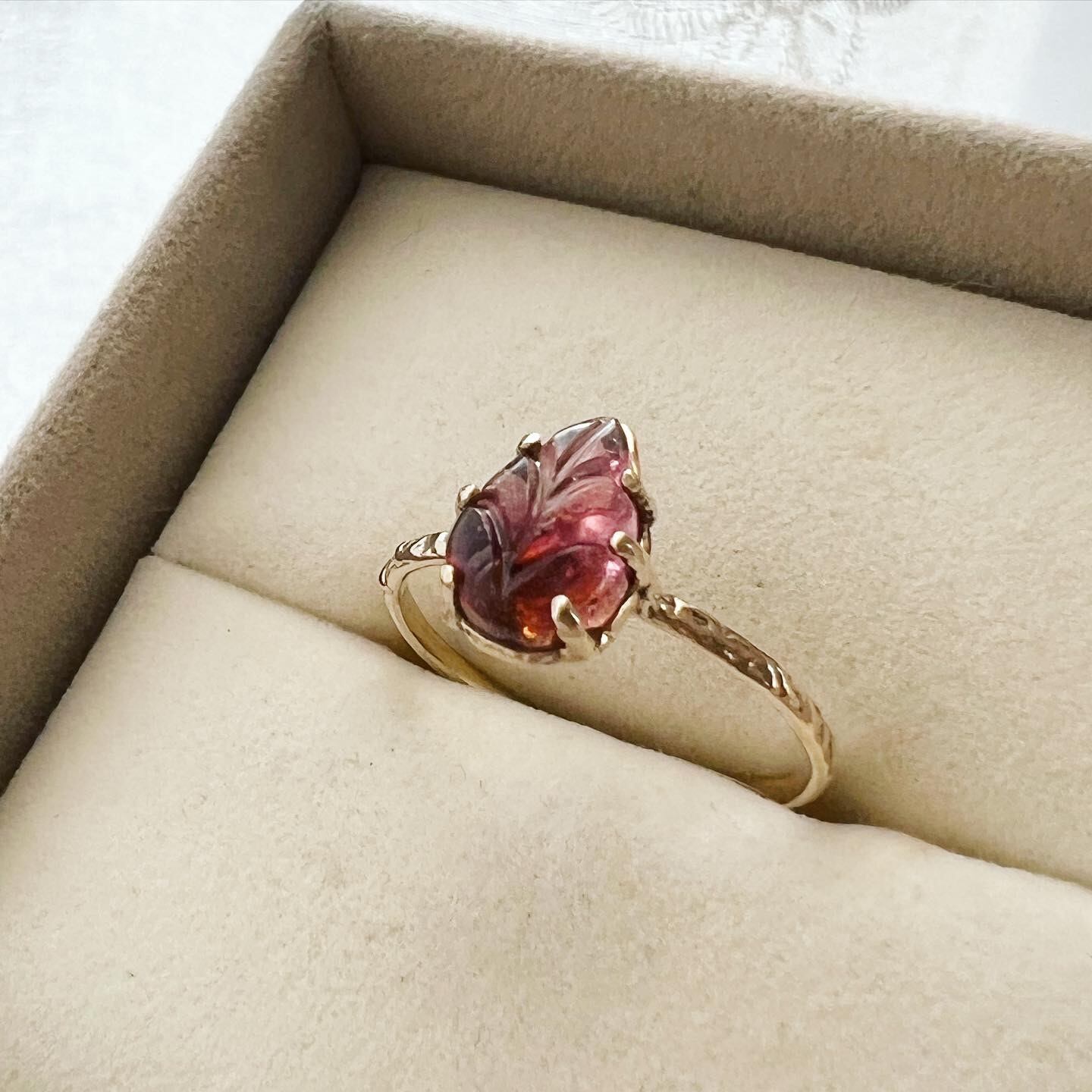 葉っぱの形にカービングされた天然石トルマリンのリングです。