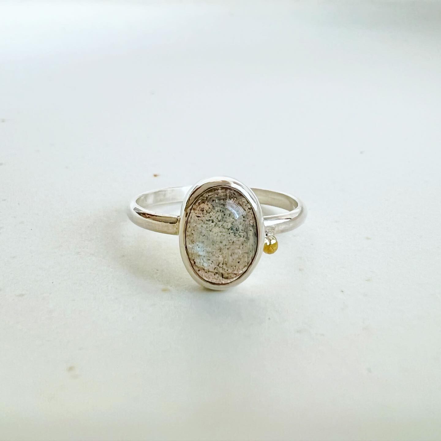 青白いシラーが神秘的なラブラドライトのカボションを1つ、シンプルなリングに。