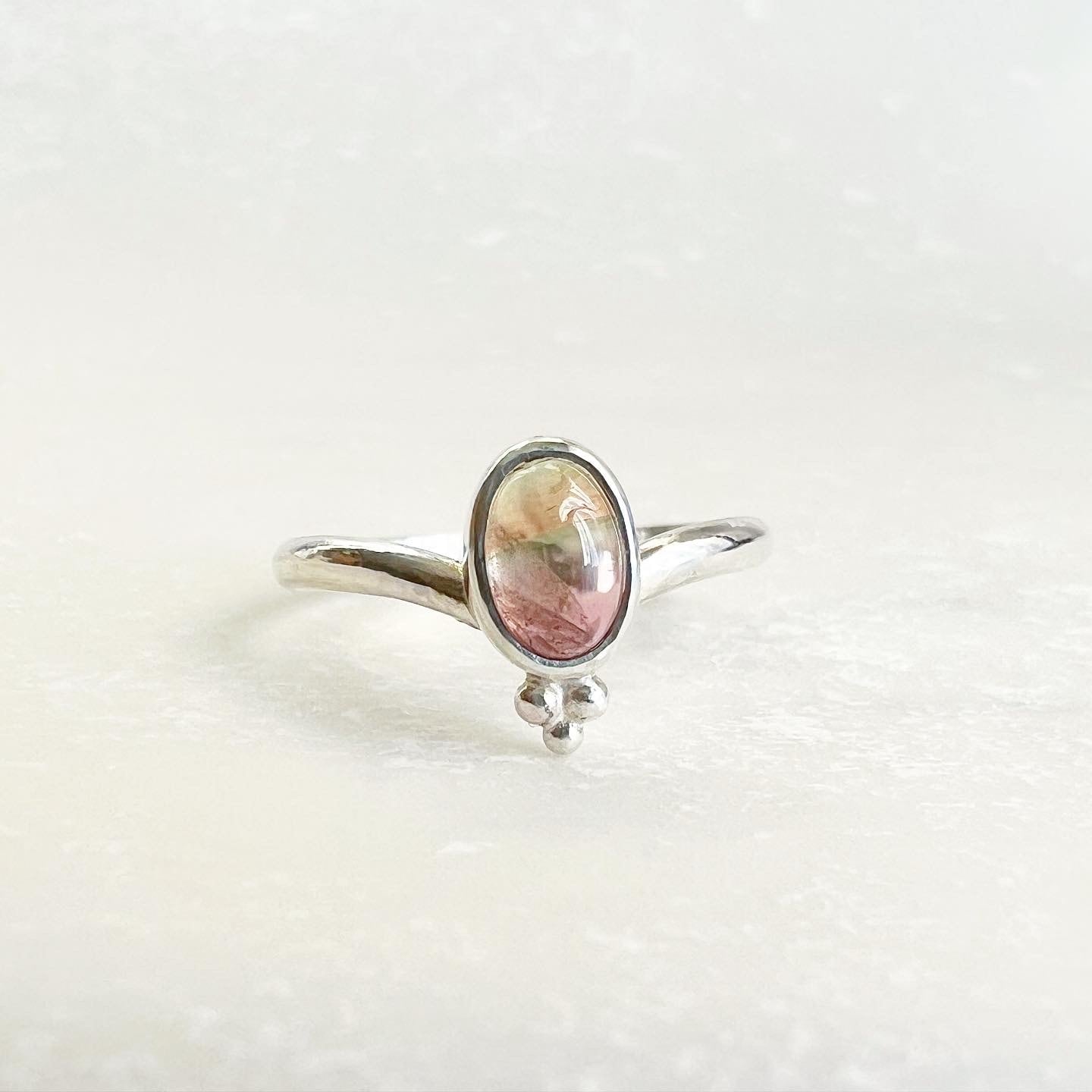 虹のようなグラデーションが可愛い小粒なトルマリンです。シンプルなリングに仕立てました。