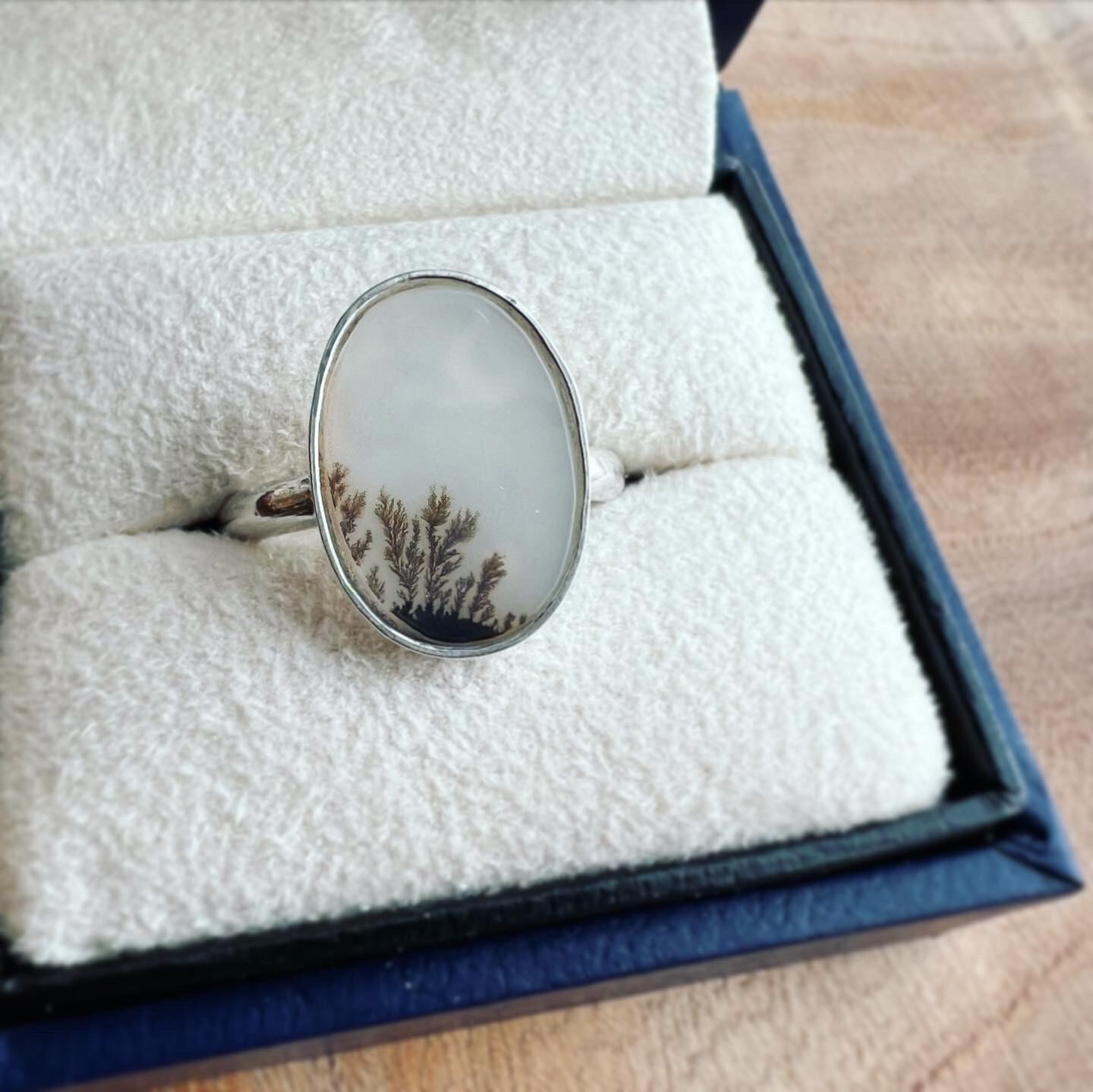 デンドリティックオパールの木々のような模様に、三日月の夜の散歩道のようなシルエットを楽しんでいただきたいリングです。