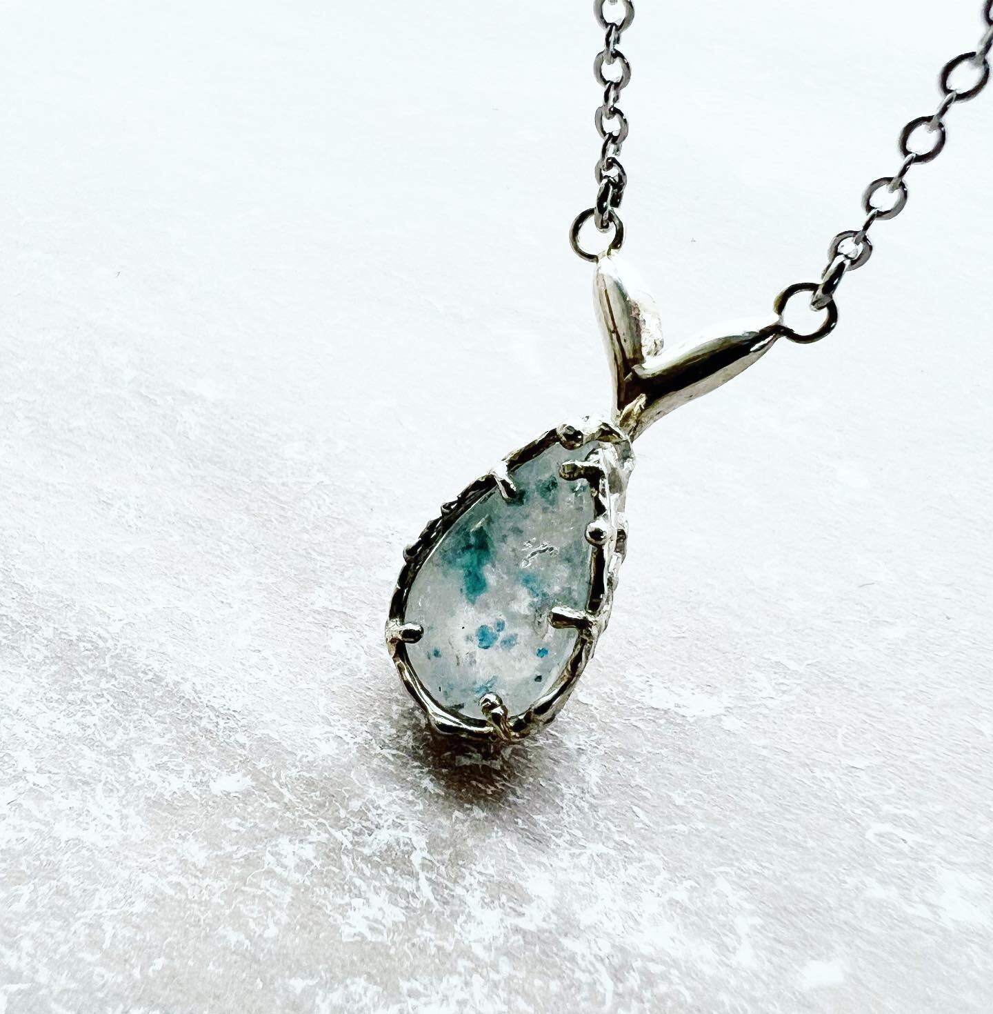 水晶の中でキラキラと弾けるような青い水玉がとても可愛い天然石パライバクォーツ。