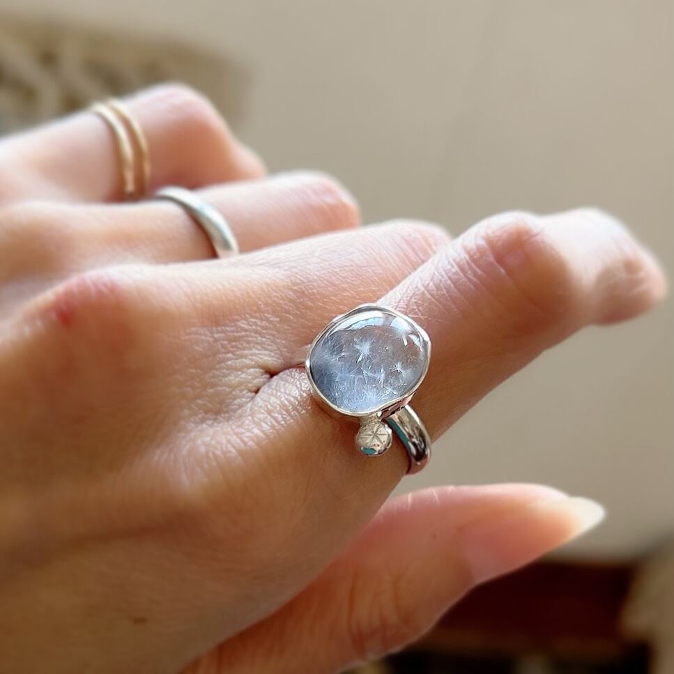 白い星が瞬く美しい夜空のようなデュモルチェライトインクォーツを、シンプルなリングに仕立てました。