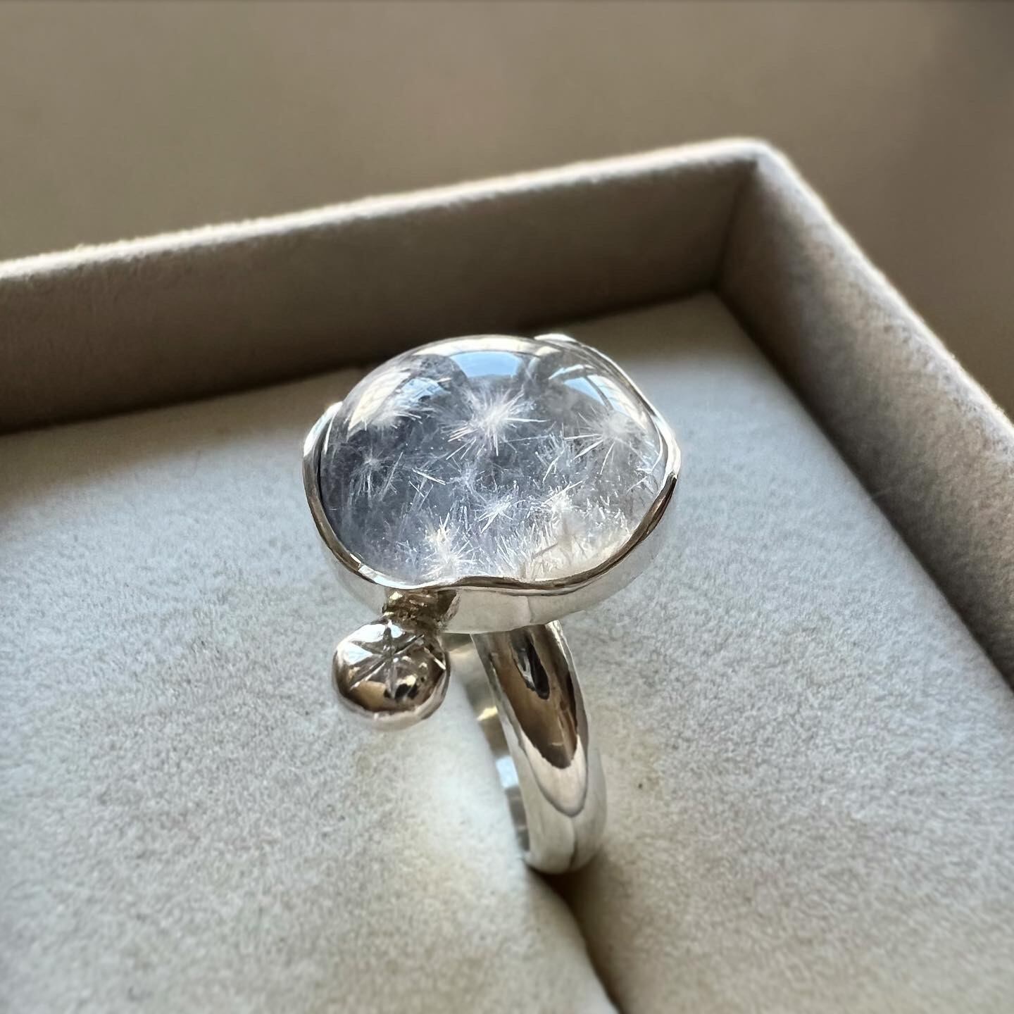 透明度の高いドーム状の水晶の中で、針状の青い結晶に白い星か綿毛のような結晶がフワフワと散っています。