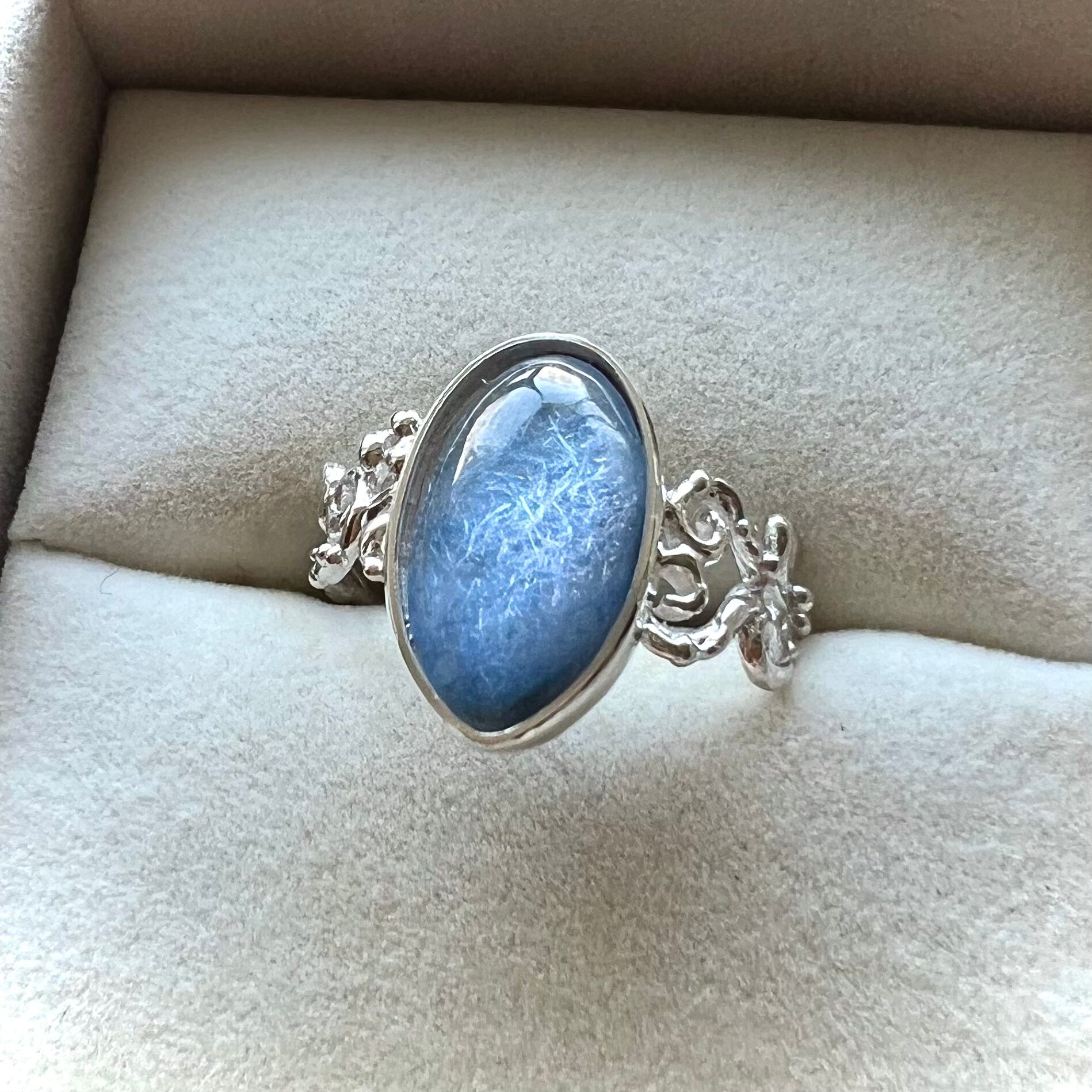 青い繊維状、針状の結晶がクォーツの中に広がる、美しく幻想的なデュモルチェライトインクォーツ。