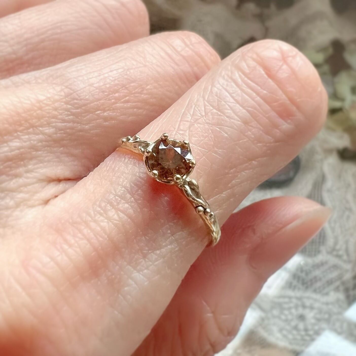 黄味の強い華やかな輝きにブランデーを結晶にしたようなガーネットがキラキラと映えます。